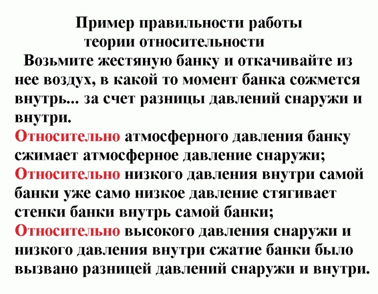 Мы откачали из жестяной банки воздух, банка сжалась за счет разницы низкого давления внутри (вакуума) и внешним атмосферным давлением. Внешнее давление остается постоянным и не меняется, а меняется именно давление вакуума внутри. Так какое давление сжимает банку ? Давление которое остается постоянным или давление которое изменяется ? Конечно то которое изменяется т.е. давление ниже атмосферного.
