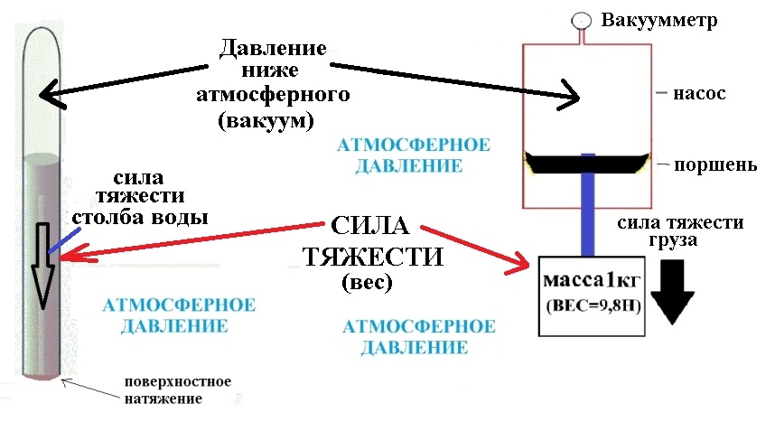 Столб воды в трубке имеет вес, который имеет вектор (тянет) воду вниз. Так как система "вода трубка" герметична, то внутри трубки под действием силы тяжести столба воды образуется разряжение воздуха, который сопротивляется изменению своего объема, в результате чего столб воды удерживается на весу в трубке с открытым снизу концом, который соединяется с относительно постоянным давлением атмосферы. Поэтому столб воды оказывается "зажат" с двух сторон: снаружи атмосферным давлением, а изнутри разряжением. Вес столба воды уравновешивается давлением атмосферного воздуха снизу - это ерись, потому что давление ниже атмосферного внутри трубки уравновешивается давлением атмосферного воздуха снаружи под действием силы тяжести столба воды. Сделав вес столба воды или вес груза на картинке справа больше, сила тяжести создаст еще большее разряжение внутри трубки и на вакуумметре мы увидим еще большее значение вакуума, потому что не вес уравновешивается, а давление внутри и снаружи уравновешивается под действием веса ! Вес столба воды не измененный !