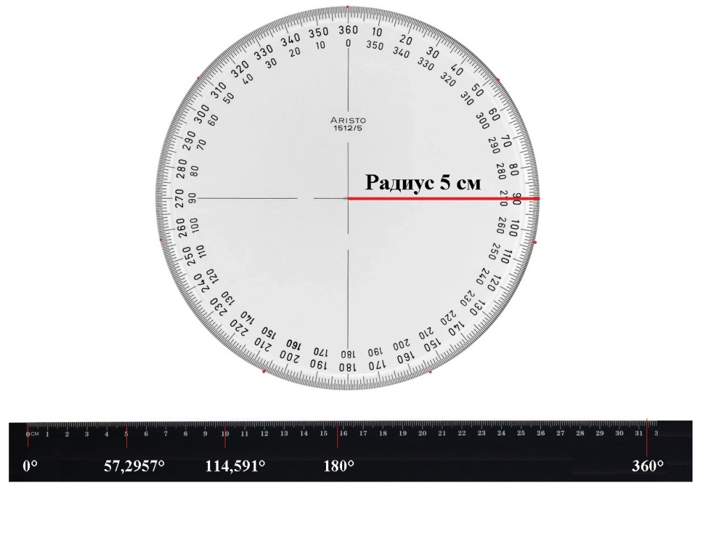 5 см линейки (радиус) = 1,146°*50 = 57,324° (1 радиан)